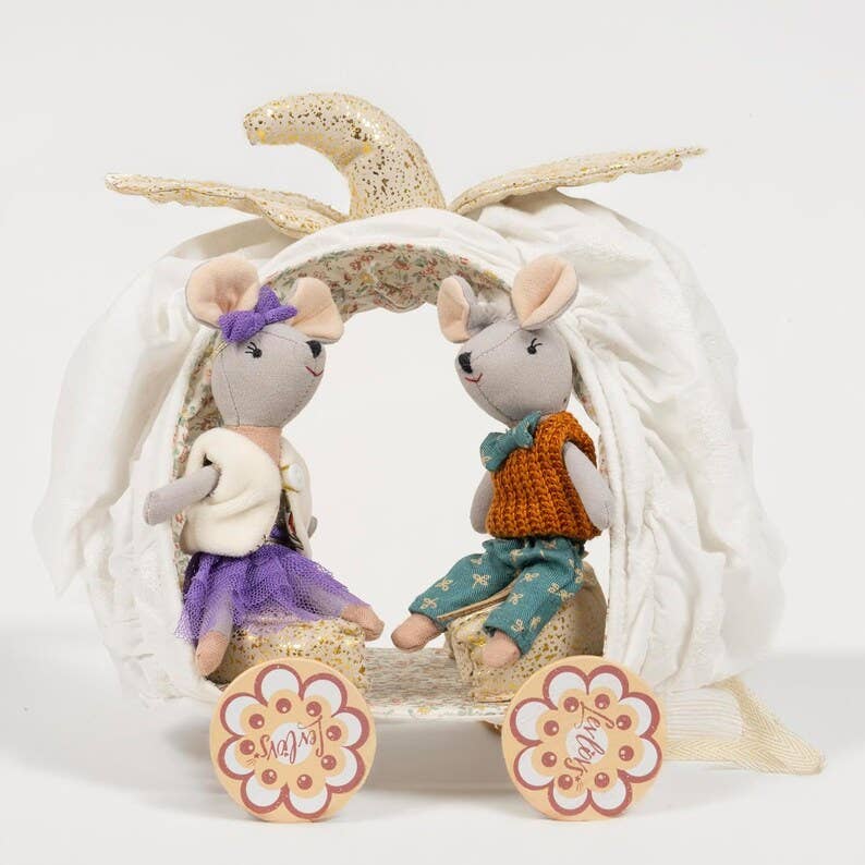 Whisk your tiny friends away to a moonlit ball with the LevLovs Pumpkin Coach—a fairy tale come to life in soft cotton and sparkling dreams! Handcrafted from plush white cotton and sprinkled with golden glitter on the stem, this carriage opens to reveal a floral-lined interior, perfect for two well-dressed LevLovs mice on their autumn adventure.