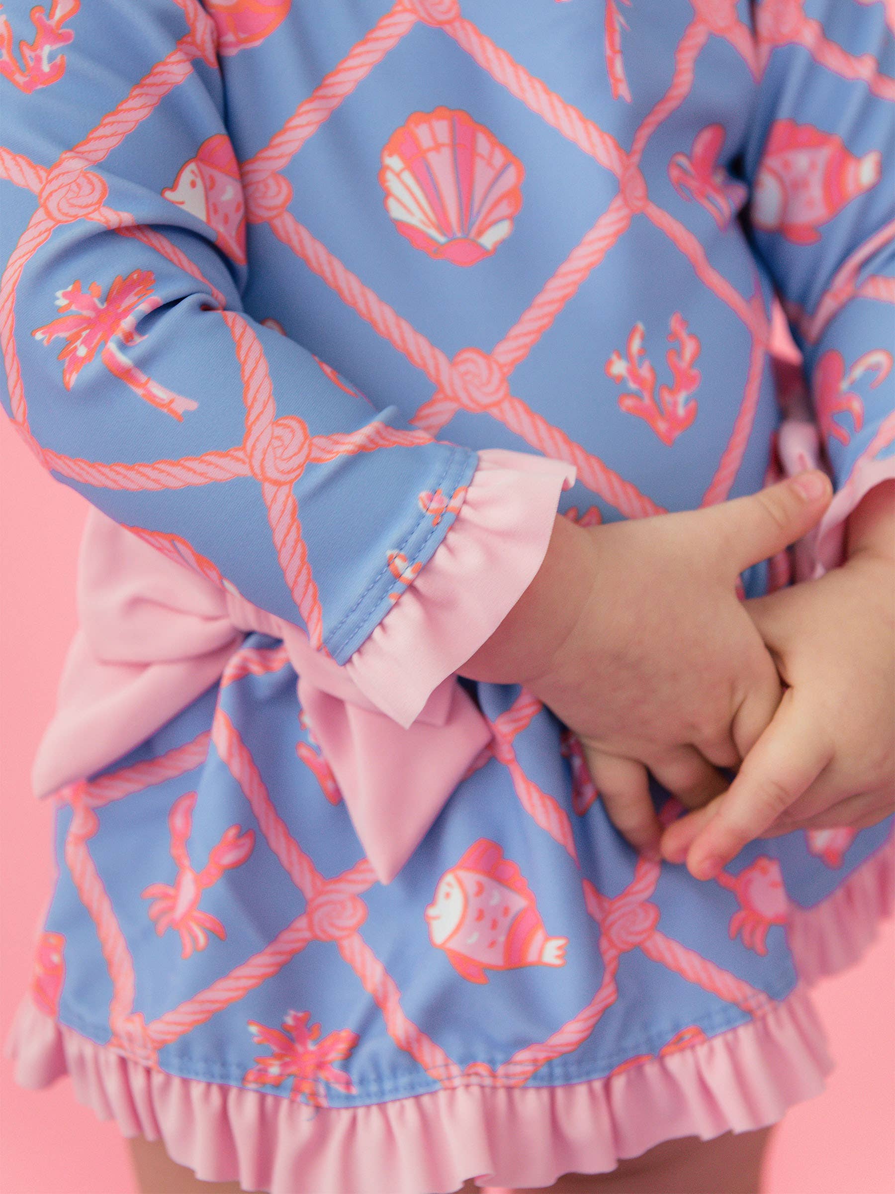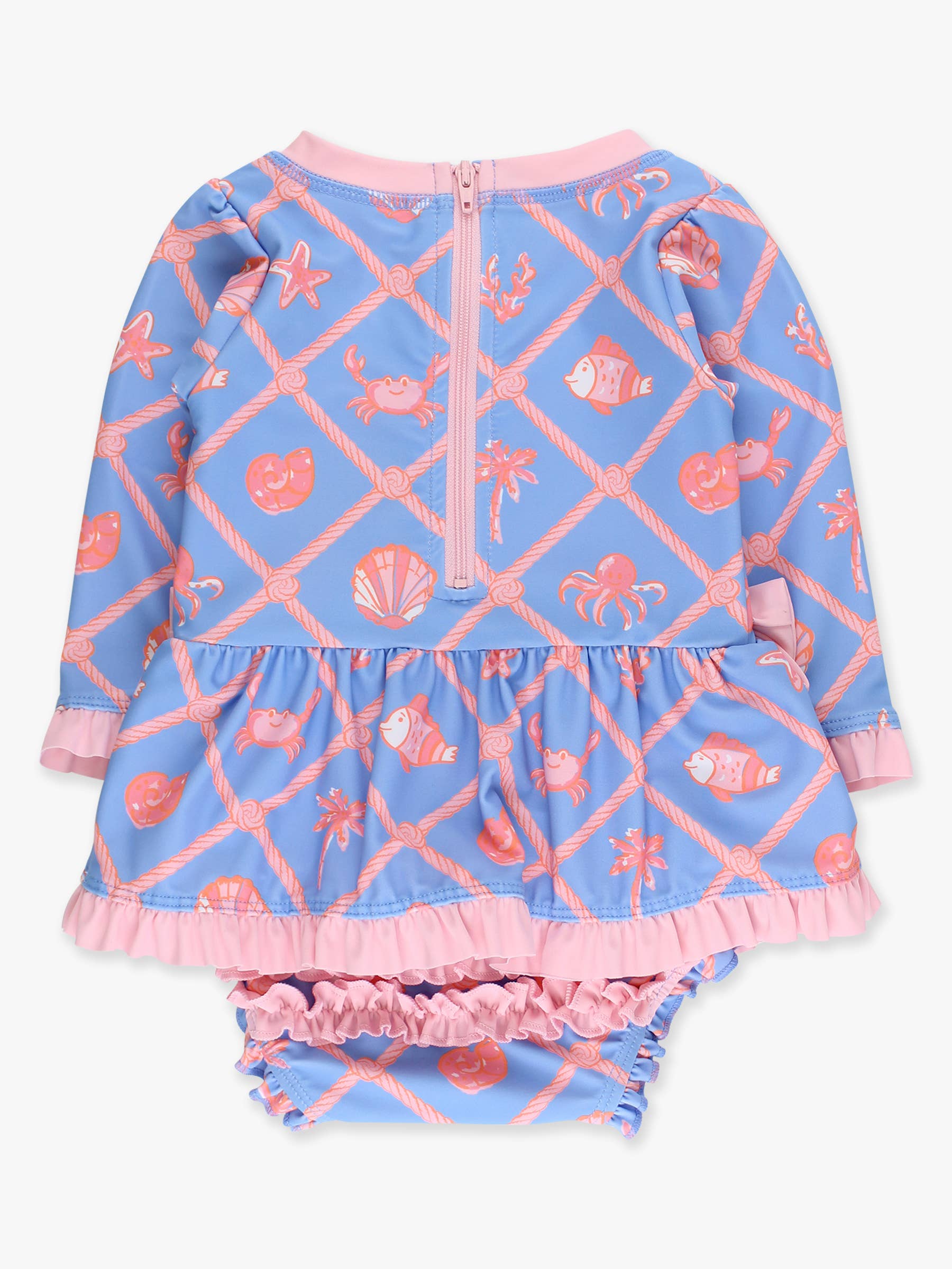 Sweet, classic, and effortlessly charming, this long-sleeve swim style is perfect for adding a touch of elegance to any little one's beach-day look. Thoughtfully designed with a playful peplum skirt, delicate bow accents at the waist, siganture rear ruffles, and convenient features like a back zipper and snap closures for easy changes. The built-in UPF 50+ sun protection and long sleeves provide extra coverage for all-day fun in the sun, combining style, comfort, and practicality.